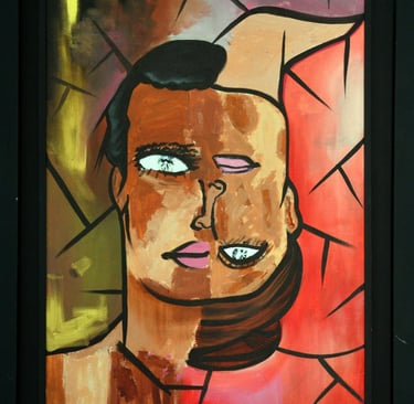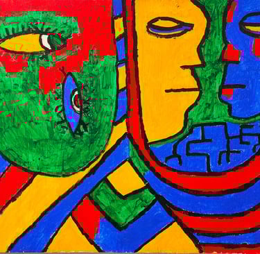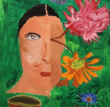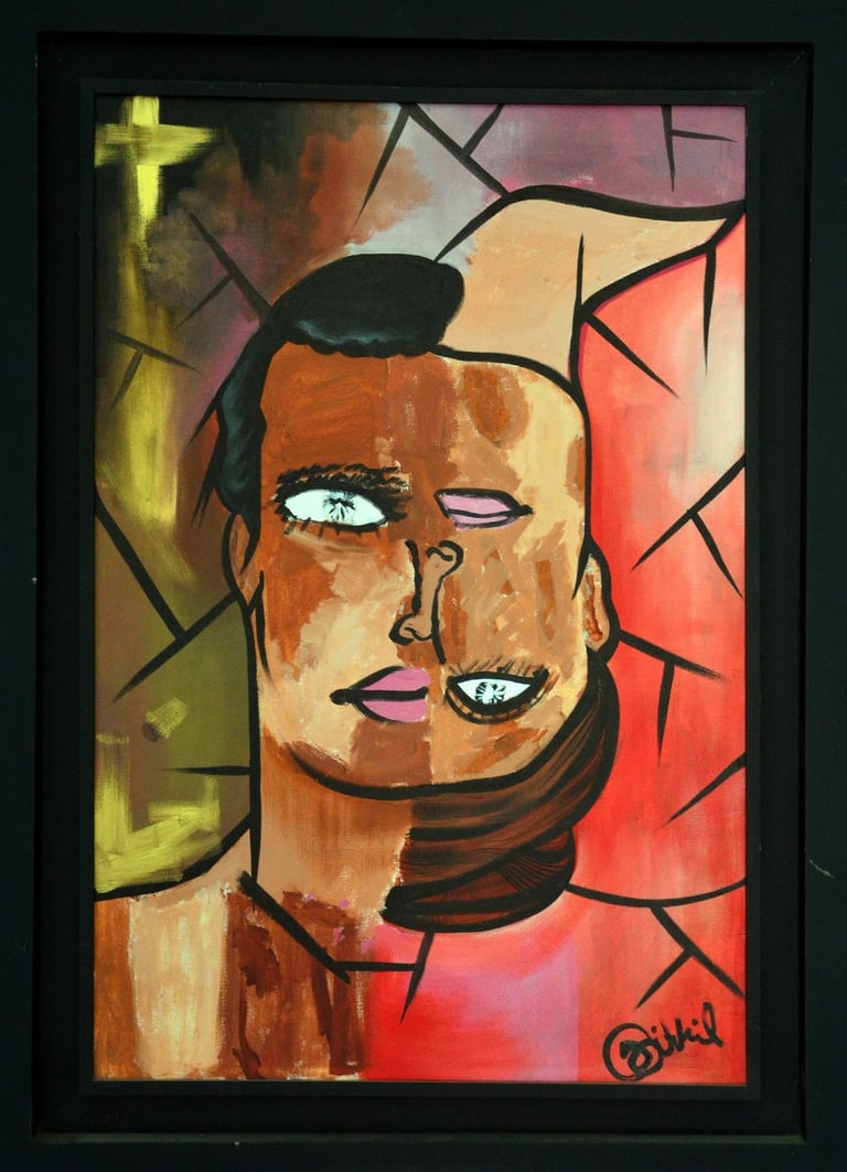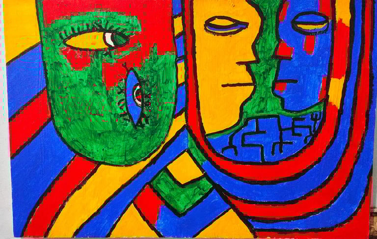 This painting to show how people can have different sides within them, expressing mixed emotions, duality, and the unusual way we sometimes see ourselves and the world.