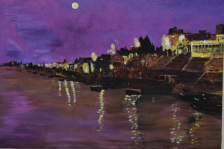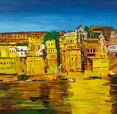 This painting to show the beauty, spirit, and golden charm of Kalighat in Banaras, capturing its peaceful atmosphere, sacred feeling, and the lively colors of the ancient riverside.