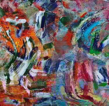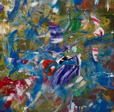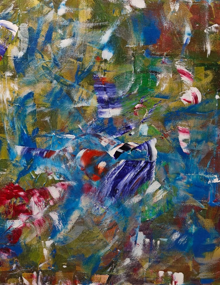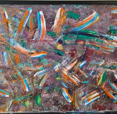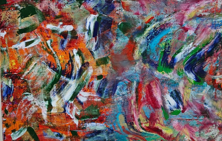 This painting tells the story of emotions colliding like fire and water, where chaos and color crash together in restless strokes, yet through the fragments of intensity, glimmers of light and harmony rise, revealing the beauty hidden within turmoil.