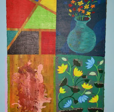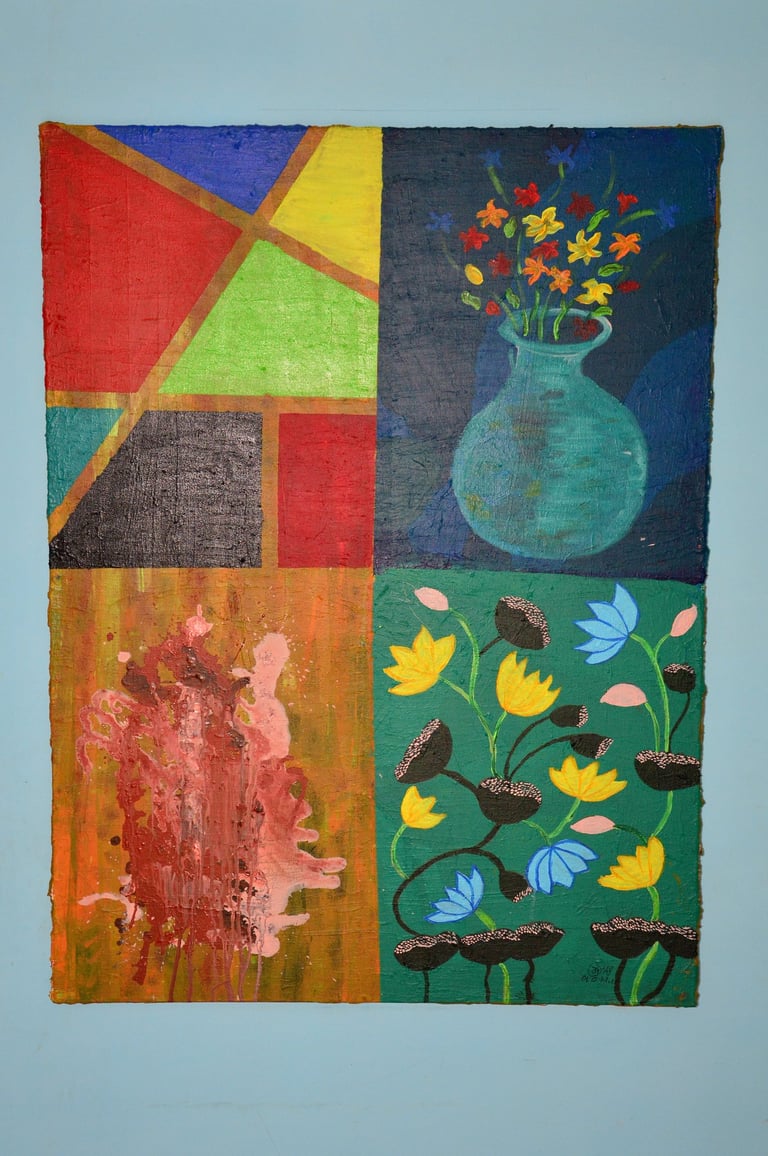 This painting shows different colorful sections—a table, a vase, textures, and flowers—coming together like small pieces of life in one frame
