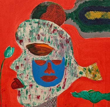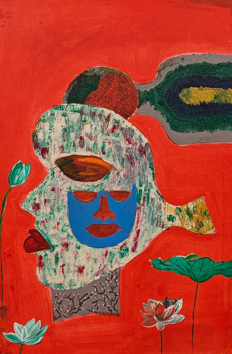 Once upon a time, two lovers from different worlds met in a dream. One belonged to the world of colour and energy, represented by the bright green face with a curious, open eye that took in everything with wonder. The other came from a world of thought and reflection, with a closed eye and a contemplative gaze, always looking inward. Though they were vastly different, they were inexplicably drawn to each other, seeing in each other what they lacked. This painting captures their union, a symbolic merging of outward energy and inward reflection. Their faces meet, but never fully overlap, for they can only touch in the realm of dreams—a bittersweet reminder of the connection between two souls bound by love yet divided by worlds.