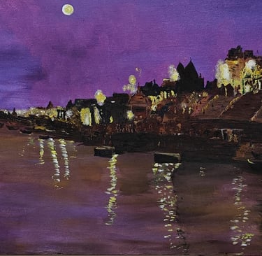 Banaras at night glowed along the ghats, where moonlight and lamps melted into the Ganga and turned the ancient city into a silent, shimmering prayer.