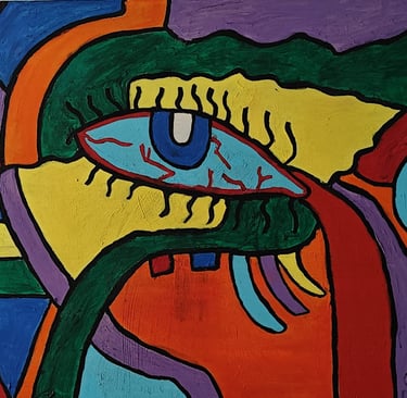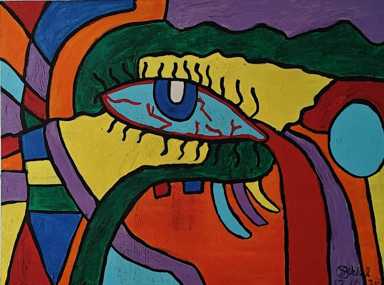 This painting shows a large, colorful eye surrounded by bold shapes, making it look like the mind is watching everything with strong feelings.