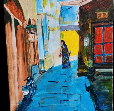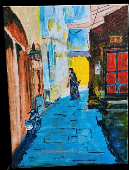 This painting shows a quiet, colorful lane of Kashi with narrow walls, bright sunlight, and a woman walking peacefully through the vibrant old street.