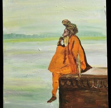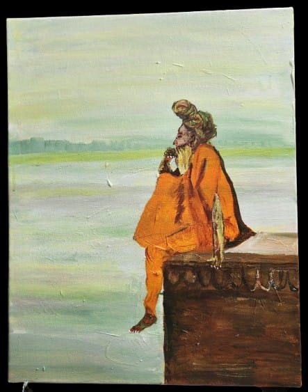 This painting shows a peaceful sadhu sitting quietly at a Kashi ghat, looking out over the calm river in deep thought and meditation.