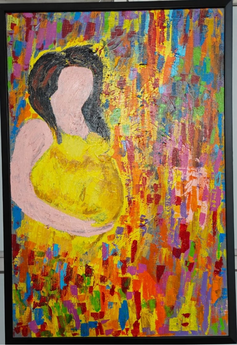 This painting shows a mother holding her child, surrounded by bright colors that make her love and warmth feel like a beautiful blossom.
