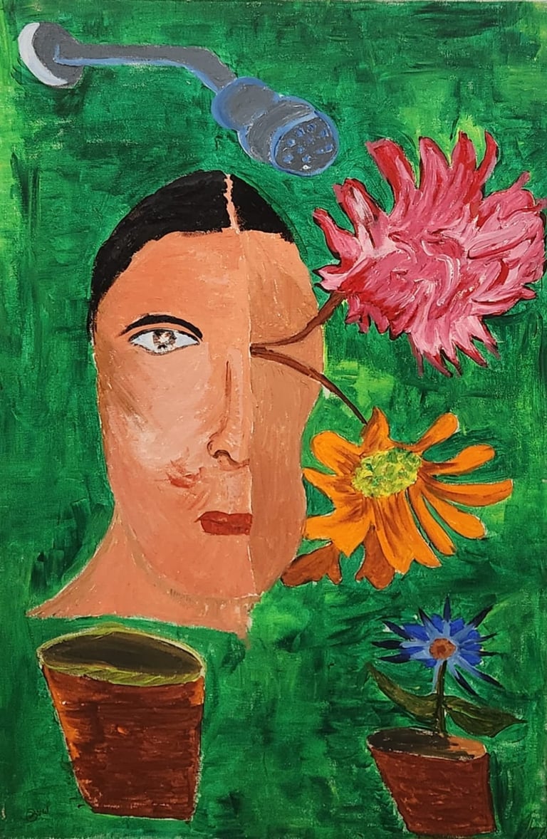 This painting shows a face surrounded by blooming flowers and pots, with a watering can above, creating the image of a gentle gardener who helps life grow.